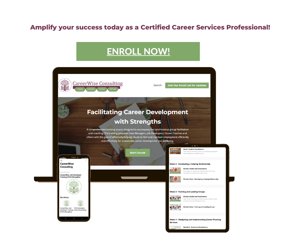 Turn your Job/Career Center into a Placement Powerhouse while improving engagement, retention and well-being of both staff and clients. Build a strengths-based team or oganization.